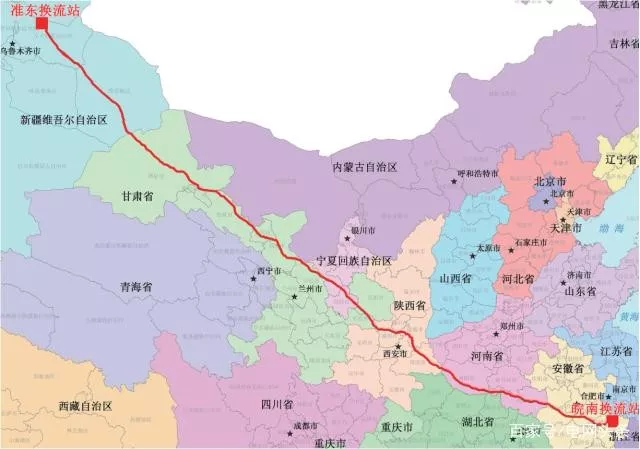 准东-皖南±1100千伏特高压直流输电工程起于新疆昌吉州昌吉换流站,止于安徽宣城市古泉换流站,途经新疆、甘肃、宁夏、陕西、河南、安徽六个省区,送电距离3324公里,输送容量1200万千瓦,每年可向华东用电负荷中心输送600-850亿度电能,将有效缓解华东地区中长期电力供需矛盾,促进西部、北部能源基地开发与外送。