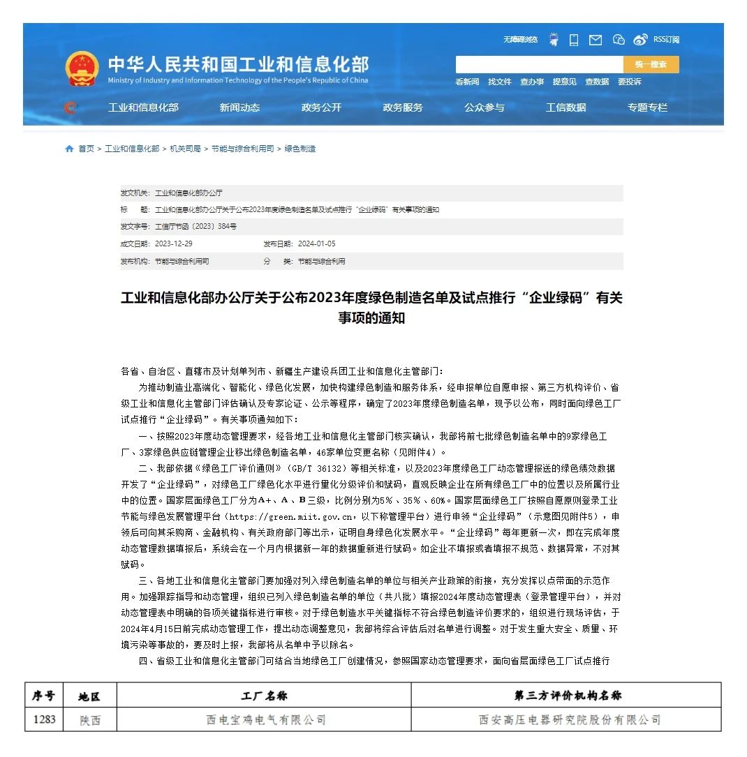 近期,国家工业和信息化部公示2023年度绿色工厂名单,太阳成集团tyc138所属西电宝鸡电气成功入选。