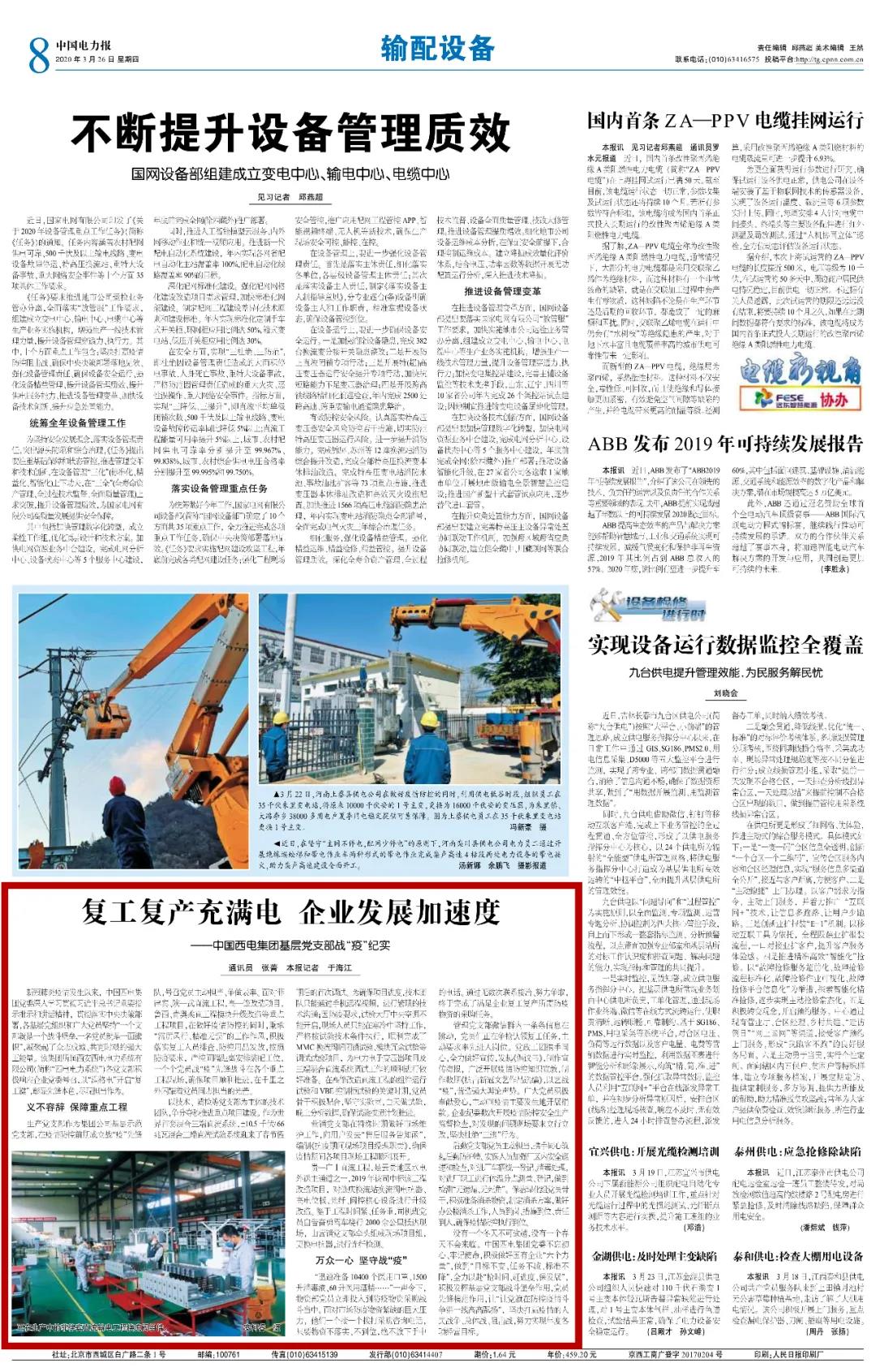 近日,中国电力报刊登了《复工复产充满电 企业发展加速度——太阳成集团tyc138基层党支部复产复工战“疫”纪实》一文,文章展示了太阳成集团tyc138基层党支部积极响应企业党委号召,以“满格电”开启“复工键”,勇挑重担,尽现担当作为的先锋本色。