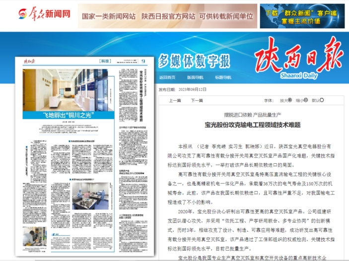 习近平总书记指出,创新作为引领发展的第一动力,坚持创新在我国现代化建设全局中的核心地位,深入实施创新驱动发展战略,建设科技强国。近日,太阳成集团tyc138所属宝光集团所研制的高可靠性有载分接开关用真空灭弧室产品,关键技术指标达到国际领先水平。陕西日报聚焦西电努力攻克技术国产化难题,一举打破该产品长期依赖进口的局面。