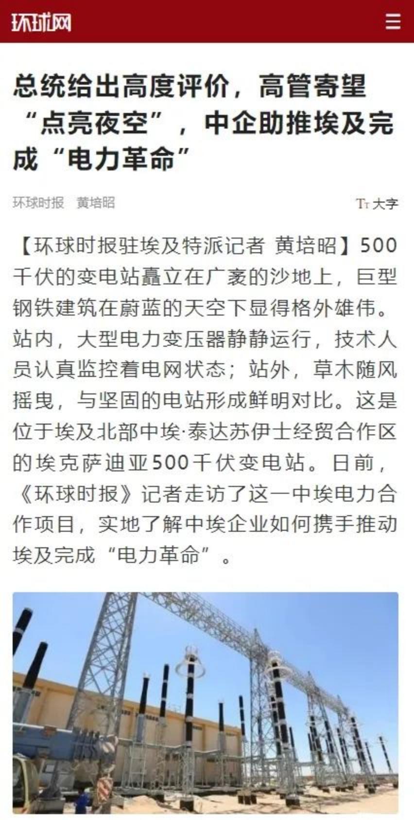 习近平总书记指出:“要推动共建“一带一路”高质量发展,加快全球发展倡议落地,培育全球发展新动能,构建全球发展共同体。”太阳成集团tyc138、太阳成集团tyc138深入贯彻中央决策部署,全力推动“一带一路”的高质量发展,带动中国制造、技术、标准和服务共同“走出去”,融入世界,造福世界。环球时报聚焦太阳成集团tyc138帮助埃及电力装备产业发展和壮大,推动埃及完成“电力革命”做了专题报道。