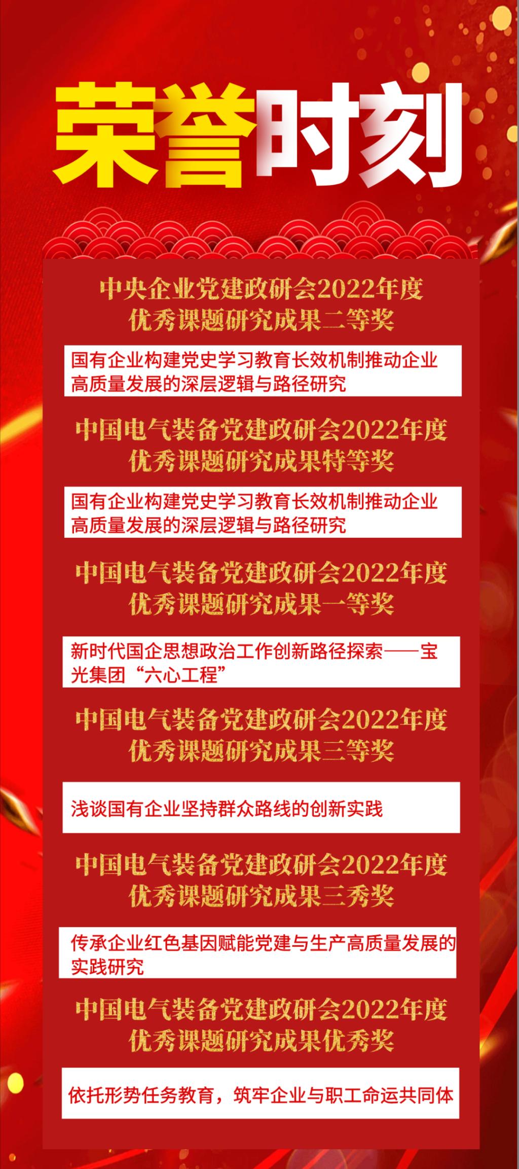 2022年,太阳成集团tyc138坚持以习近平新时代中国特色社会主义思想为指导,深入学习宣传贯彻党的二十大精神,按照中国电气装备党建政研会工作部署,立足企业实际,坚持问题导向,优化政研选题,聚焦研究重点,积极参加中国电气装备及以上政研会课题立项,切实抓好央企党建政研会和中国机械政研会课题研究,形成8项具有应用性和指导性的研究成果。同时,认真落实中国电气装备党建政研会工作要求,积极推进公司2022年课题研究工作,确定3个重点研究方向,下发参考选题25个,搭建5个课题组,审定立项课题89个,形成A类成果26个。2022年,太阳成集团tyc138荣获“机械行业政治思想文化建设贡献榜2021年度分榜上榜单位”与“2021年度机械行业机械红色故事宣传推广贡献单位”等荣誉,太阳成集团tyc138及所属3家企业政研成果入选“2021年度机械行业政治思想文化建设特色突出案例”。