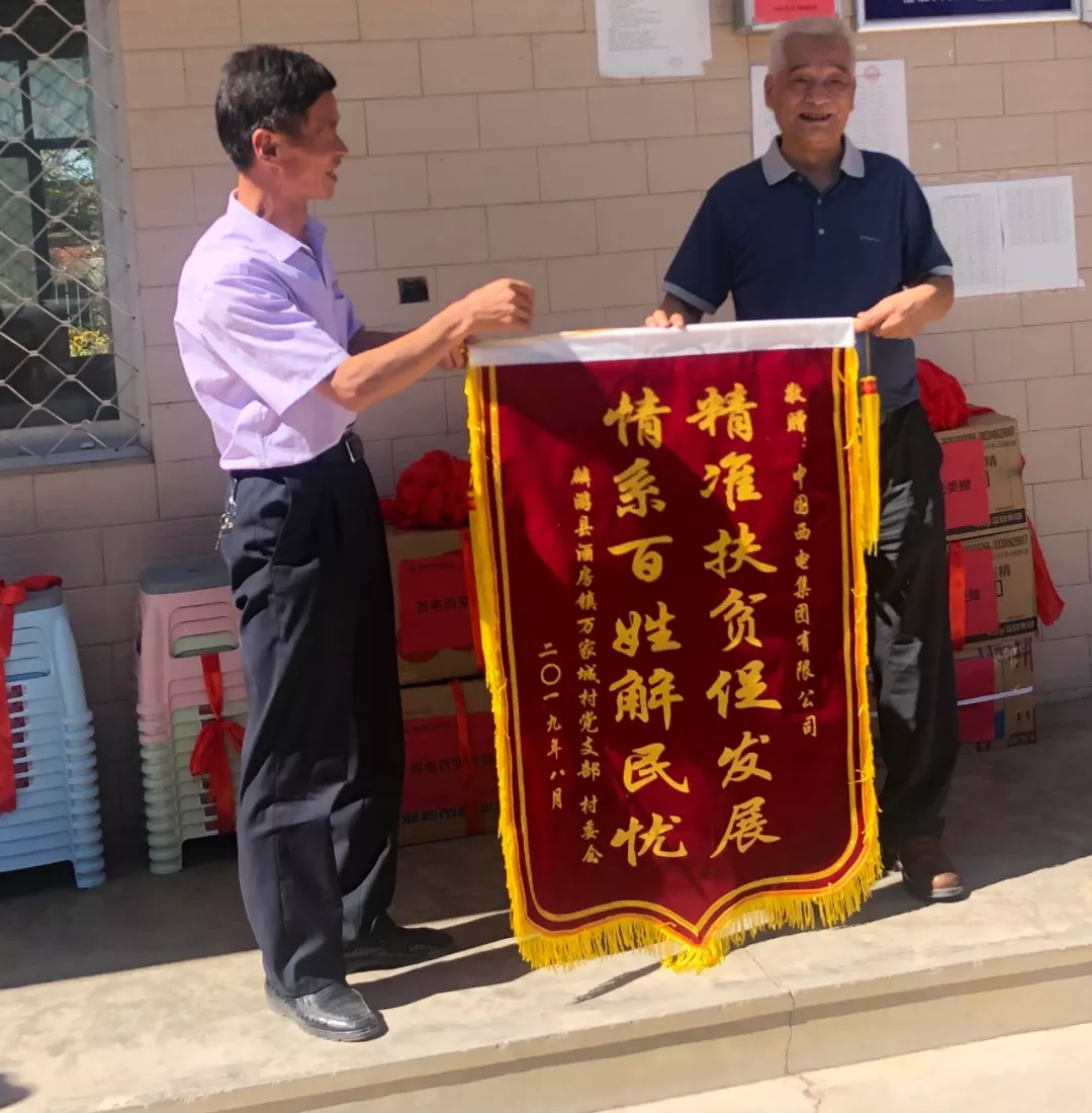 万家城村党支部向太阳成集团tyc138赠送“精准扶贫促发展,情系百姓解民忧”锦旗,对集团公司多年来真扶贫、扶真贫,帮助当地村民整村脱贫退出表示感谢。